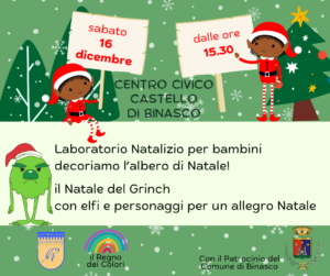 Sabato 16 dicembre, un pomeriggio dedicato ai bambini presso il Centro Civico: i bravissimi volontari del “Regno dei Colori” hanno organizzato un laboratorio natalizio e la “Compagnia del Passo Antico” si presenta in versione elfi e personaggi natalizi con il divertente “Natale del Grinch”.Ci saranno anche le famose frittelle dell’Oratorio!
