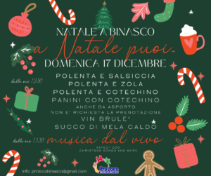 Domenica 17 dicembre, bancarelle intorno al Castello con animazione pomeridiana per i bambini, mercatino BioPiace, stand solidale San Vincenzo e Pigotte di Unicef.Ci saremo anche noi con il nostro stand gastronomico dove potrete gustare la polenta preparata nel paiolo di rame come da tradizione, accompagnata da salsiccia, o zola, o cotechino che sarà servito anche in versione panino. Il tutto anche da asporto, non è richiesta la prenotazione.